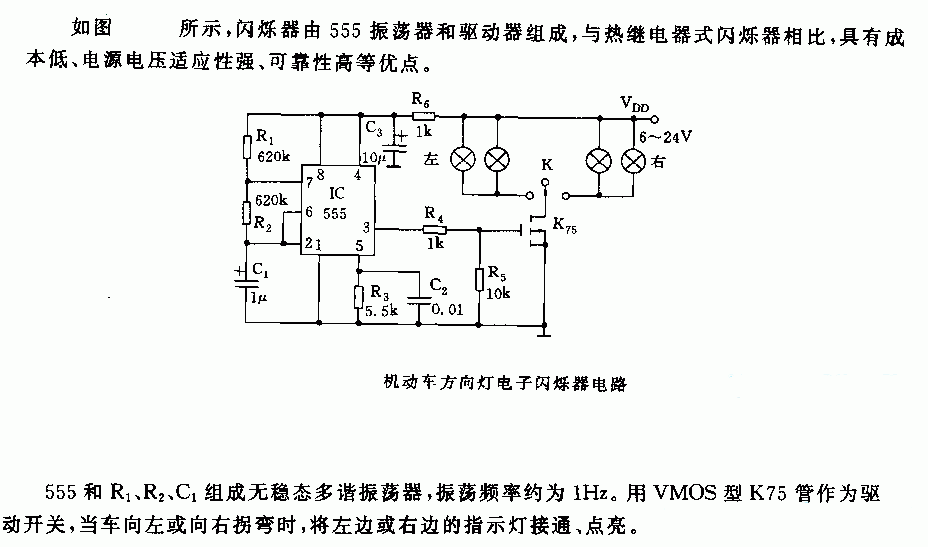 機(jī)動(dòng)車方向燈電路如下圖所示,由555芯片及MOS管驅(qū)動(dòng)器組成,與熱繼電器式閃爍燈相比,具有成本低,電源電壓適應(yīng)性強(qiáng),可靠性高等優(yōu)點(diǎn).