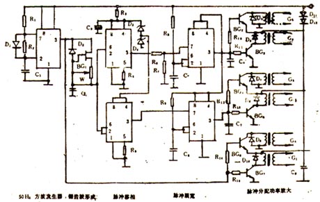 以IC1和三極管BG6、BG7電路為例:當IC1③腳輸出高電平正脈沖時,三極管BG6反偏截止,BG7管正偏導通,其集電極電流以線性增大,經脈沖變壓器互感耦合,在次級上輸出矩形脈沖;當IC1的③腳為低電平輸出時,BG,管零偏截止,BG6管因發射極電位升高而導通,其集電極電流也以線性增大,經脈沖變壓器在次級上輸出矩形脈沖。由此可見,BG6、BG7兩管交替地導通與截止,在次級上輸出的U4滯后U1180°。同理U5滯后U2180°,U6滯后U3180°,而輸入脈沖U2滯后U160°,U3滯后U460°,U6滯后U560°,完成整個系列觸發脈沖時序分配及脈沖功率放大的任務。