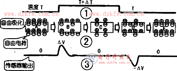 當溫度下降時,溫度又回到原來的狀態(T),其自由極化狀態如圖2D所示。由于溫度的下降變化件(相對而言)過程與溫度上升變化相反,所以,傳感器表而的電荷變化與上升時變化過程剛好相反,是個反過程。