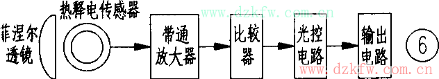 人體紅外線感應模塊具有體積小、使用方便、工作可靠、檢測靈敏、探測角度大、感應距離遠等一系列的獨特優異功能,已在各個領域里得到了廣泛應用。整個紅外線感應模塊一般包括熱釋電型傳感器、菲涅爾透鏡、帶通放大器、比較器、光控電路、延時電路、輸出電路等,如圖6所示。