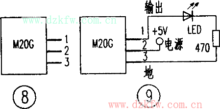 圖8和圖9分別是產品的外形圖和測試連線圖,該紅外線感應模塊外形尺寸為:20mm×20mm×15mm。電路中采用的是全貼片元件。感應模塊共有三個端子,①腳為輸出端;②腳為電源端;③腳為模塊地。檢測時請按圖9(測試圖)連接好。模塊接上電源時輸出端初始狀態為高電平,約20秒后模塊恢復靜態,此時如有人在模塊前面移動時,模塊能檢測到并同時輸出與感應信號相一致的電平。