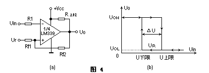 圖4a給出了一個遲滯比較器,人們所熟悉的“史密特”電路即是有遲滯的比較器。圖4b為遲滯比較器的傳輸特性。