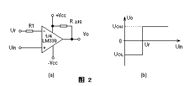 圖2a給出了一個基本單限比較器。輸入信號Uin,即待比較電壓,它加到同相輸入端,在反相輸入端接一個參考電壓(門限電平)Ur。當輸入電壓Uin>Ur時,輸出為高電平UOH。圖2b為其傳輸特性。