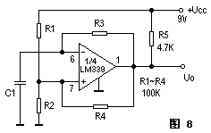 圖8為有1/4LM339組成的音頻方波振蕩器的電路。改變C1可改變輸出方波的頻率。本電路中,當C1=0.1uF時。f=53Hz;當C1=0.01uF時,f=530Hz;當C1=0.001uF時,f=5300Hz。