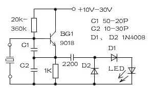 制作中應(yīng)注意:晶振的兩條引出線不能相距過近,否則振蕩幅度大大減小導(dǎo)致發(fā)光管不亮。