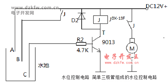 電路中4.7K電阻的作用是避免由于電路電壓過大而燒毀三極管,其中當電路開始工作時,水池中沒有水,電機工作抽水進入水池,水位很快淹沒c點,然后到達b點,此時三極管還沒有工作。最后上升到a點,三極管集電極、基極回路導通,繼電器工作,斷開電機的工作電路,等到一段時間,水池里的水自然減少,當水位下降到b點下時,三極管電路停止工作。電機開始工作,繼續抽水進入水池。又開始重復上述過程。