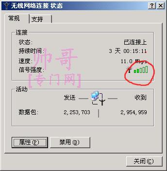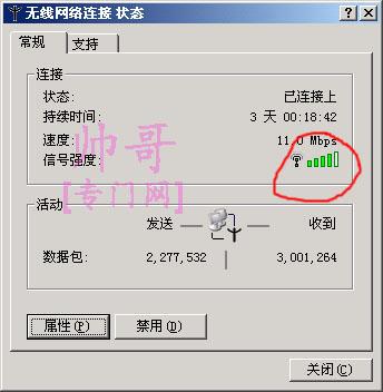 這個是原來隔了三堵墻后,帥哥的802.11a/b/g網(wǎng)卡接收到的TPlink ap信號強(qiáng)度。這個時候雖然還顯示連接速度為11M,但實(shí)際上只能以非常慢的速度訪問網(wǎng)頁,要想點(diǎn)播局域網(wǎng)內(nèi)另一臺電腦上的DVDRip電影是絕對播不出來的。