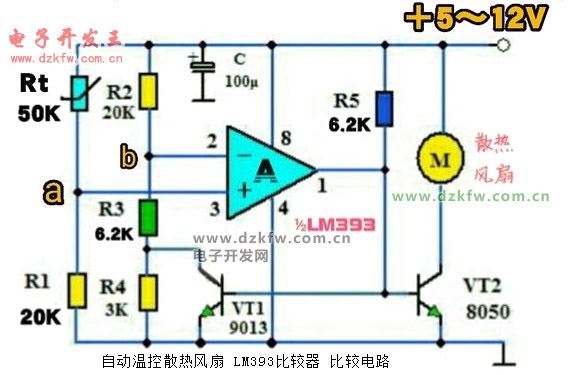 在散熱器溫度較低時,固定在散熱器上的熱敏電阻Rt的阻值較大,LM393的③腳電壓低于②腳電壓,此時LM393的①腳輸出為低電平,三極管VT1和VT2皆處于截止狀態,VT2集電極接的散熱風扇不工作。隨著散熱器溫度的升高,Rt的阻值自動減小,LM393的③腳電壓逐漸增大。當溫度升高到設定值(一般選擇在60℃左右)時,LM393的③腳電壓高于②腳電壓,其①腳輸出變為高電平,三極管VT1和VT2皆導通。此時,散熱風扇得電工作,對散熱器降溫。