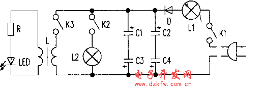 如下圖所示。K1~K3為常開開關(guān),L1、L2為25W/220V白熾燈,Cl~C4為150μF/400V彩電高壓電解電容,對接成無極性電容,L為160W(220V/12V)變壓器,D為1N4007、R為500Ω,LED為高亮度發(fā)光二極管。