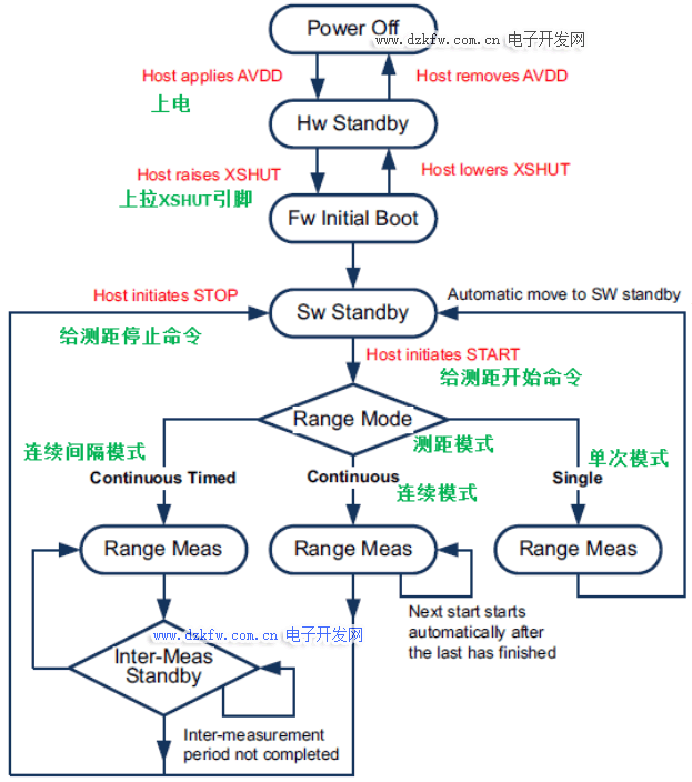 當(dāng)上電,VL53L0X會(huì)進(jìn)入Hw Standby狀態(tài),這是待機(jī)狀態(tài),功耗很低。然后拉高XSHUT引腳,讓VL53L0X進(jìn)入Fw Boot狀態(tài),開(kāi)始準(zhǔn)備測(cè)距。如果不需要待機(jī)狀態(tài),可以把XSHUT接到AVDD上。VL53L0X處于休眠狀態(tài)是不能進(jìn)行通信IIC