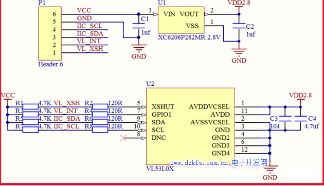 模塊通過(guò) P1 排針與外部連接,引出了 VCC、 GND、IIC_SDA、 IIC_SCL、 VL_INT、 VL_XSH 信號(hào)。