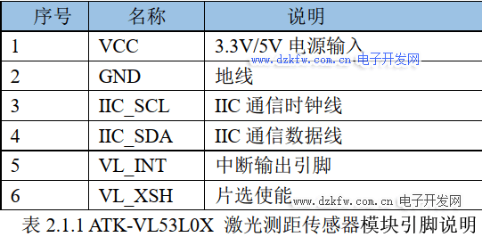 2.ATK-VL53L0X 激光測(cè)距傳感器模塊通過(guò)一個(gè) 1*6 的排針(P1)同外部電路連接,各引腳的詳細(xì)描述如表 2.1.1 所示: