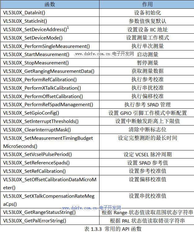則對(duì)以上的底層函數(shù)進(jìn)行封裝,提供包括系統(tǒng)初始化、測(cè)量模式配置、參數(shù)配置、校準(zhǔn)功能、狀態(tài)信息獲取、以及中斷配置等 API 函數(shù)。在一般的使用時(shí),直接調(diào)取 vl53l0x_api.c 提供的 API 函數(shù)就可以了。