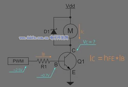 計算電壓:通常求解三極管電路時,我們可以先假設它處于導通狀態。在導通狀態下,三極管因其內部的P-N結半導體特殊結構,使得B點(Base,中文術語叫:基極)的電壓比E點(Emitter,中文術語叫:射極)電壓高0.7V左右。圖4中請參考紅色部分。由于E點電壓為0V(接地),所以B點電壓約為0.7V。以50%的占空比為例,那么輸入端PWM的等效電壓為2.5V。另一個重要的電壓節點是C點(Collector,中文術語:集極),如果我們不知道馬達的內阻,就無法直接計算。但是我們可以在實驗中直接測量VC的電壓。