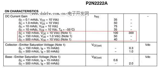 計算電流:圖4中的藍色部分標出了電路方向。通過歐姆定律,我們可以很容易得算出IB,也就是基極電流。IB相當于打開三極管閥門的電流,這個電流通常在mA或者uA級。而真正用于驅動馬達的電流是IC,集極電流。IC和IB電流之間的倍數稱之為DC電流增益,常記作β。不過在上圖的公式中我們用hFE表示,原因是大部分三極管的數據手冊中都是這么叫的。圖5中我們截取了2N2222A三極管的數據手冊,可以看出hFE通常可以產生幾十倍甚至幾百倍的直流電流增益。