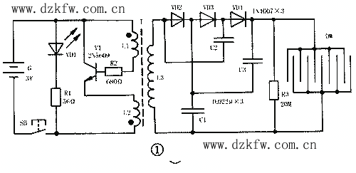 電路中,發光二極管VD1和限流電阻器R1構成指示燈電路,用來指示電路通斷狀態及顯示電池電能的耗損情況。