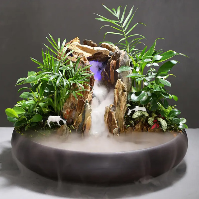 電子噴泉與盆景藝術相結合, 可以產生噴云吐霧的效果, 使人感覺到了人間 “仙境”, 同時利用它加熱濕氣, 是干燥地區室內理想的加濕保健工具。