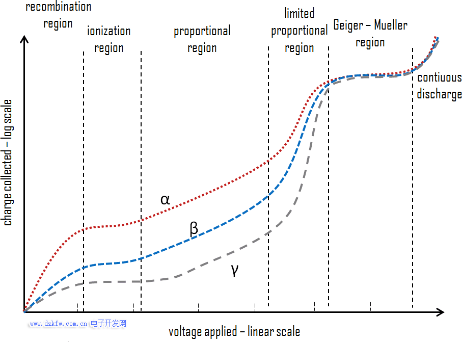 當電壓超過一定閾值之后,Geiger管就會形成連續的脈沖輸出,對于實際的放射性粒子就不再敏感。