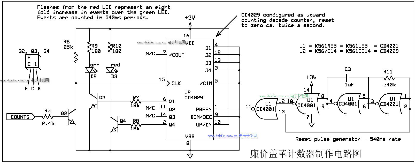 圖中上面那個圖,是一個類似于差拍計數器,兩個不同顏色的LED閃動顯示,由CD4001四2輸入或非門組成穩定的震蕩電路輸出具有一定時間間距的脈沖信號。CD4029 是由具有預進位功能的4 位二進制或BCD 碼十進制加減計數器構成,15腳是時鐘/脈沖輸入引腳,輸入的信號和振蕩器輸入的信號分別輸入到CD4029進行控制。目前此類電路實際應用很少。 下面那個圖是個和電蚊拍電路相差不多的高壓發生電路,簡單的原理是由三極管Q1為核心的放大原件,繞組5-6是Q1的負載線圈,Q1集電極有分壓電阻R1\R2,通過3-4線圈以及電源負端構成回路,當電源開關接通瞬間,回路獲得電壓,同時由于線圈的瞬時儲能作用,釋放較大的電壓使Q基極獲得電壓,而導通,5-6繞組就獲得放大后的電壓,通過T1變壓器鐵心的耦合,使3-4線圈以及副繞組7-8獲得感應電壓,然后再通過3-4線圈經過電阻R1限流輸入到Q1基極控制Q1,就這樣周而復始的工作,為了穩定頻率,還應當加入反饋電容。變壓器自己繞是比較麻煩的,你可以找代用的,你找一個變壓器參數為一組AC220V輸入、兩組3V、5V輸出,參數相近的都可以,功率10W以下的變壓器代用就可以了,一般收音機,小錄音機有,有時候會缺一組線圈,你自己繞上去就可以了,一般找相同線徑的銅絲繞個20圈就好了。接電路的時候要反過來接,就是3v、5v兩組分別構成T1的3-4,5-6繞組,220v就是輸出端,簡單吧。輸出端加個IN4007二極管整流,找個大點的104電容濾波就可以了,其他的也不用按照圖上的接了,但低壓震蕩電路這邊的原件一定要弄好,不然不會工作的。注意這個電路有一定的危險性。