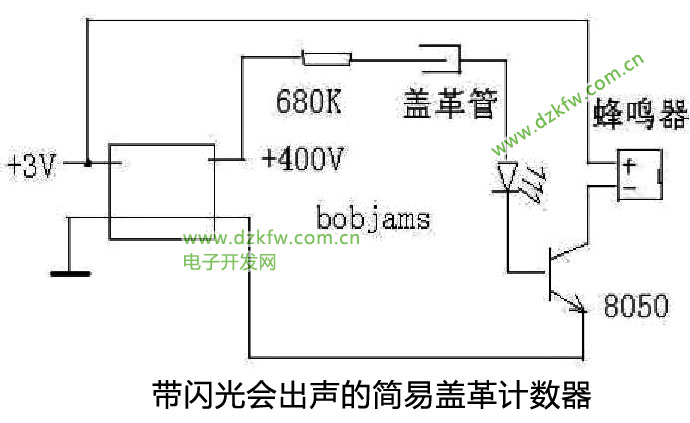 買了只蓋革計數管外加一個簡單的3V-400V升壓電路做了個蓋革計數器。手頭有電腦主板上拆下來的蜂鳴器(加電壓就會響的那種),電路直接用發光二極管閃光顯示,省去了現在比較難找的氖管。用蜂鳴器發出“咯、咯”聲。電阻值需要實測確定,在200K-820K之間,使本底計數在30次/分左右。電阻值高了不計數,阻值低了會淬熄失敗。電腦里沒有PROTEL,懶得裝了,就用WINDOWS畫圖畫的電路。