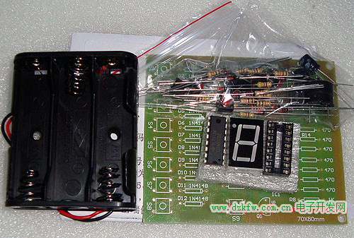 本搶答器電路可同時進行八路優先搶答。按鍵按下后,蜂鳴器發聲,同時(數碼管)顯示優先搶答者的號數,搶答成功后,再按按鍵,顯示不會改變,除非按復位鍵。復位后,顯示清零,可繼續搶答。S1~S8 為搶答鍵;S9 為復位鍵;CD4511 是一塊含BCD—7 段鎖存/譯碼/驅動電路于一體的集成電路,其中1、2、6、7 為BCD 碼輸入端,9~15 腳為顯示輸出端,3 腳(LT)為測試驗出端,當"LT"為0 時,輸出全為1,4 腳(BI)為消隱端,BI 為0 時輸出全為0,5 腳(LE)為鎖存允許端,當LE 由"0"變為"1"時,輸出端保持LE 為0時的顯示狀態。16 腳為電源正,8 腳為電源負。電路的供電電壓是4.5V,套件中配有三節5號電池盒,方便使用。。