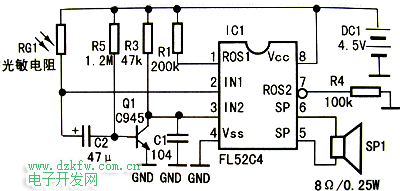 本產品采用光敏電阻來檢測環境光線,當有人靠近迎賓器時,由于人體遮擋住部分光線,光敏電阻采集到的光線強度由強變弱,經C2耦合后經Q1三極管高增益放大后輸入IC1的反相輸入端,這個信號和同相輸入的信號在IC1內部運算放大后形成觸發信號,驅動語音電路工作,發出“你好!歡迎光臨!”的女聲然后又自動進入低功耗守候狀態。光敏電阻裝入一根黑色的塑料管中,可以很好地避免環境光線的干擾,并且保證只檢測正前方光線的變化,確保動作靈敏可靠。