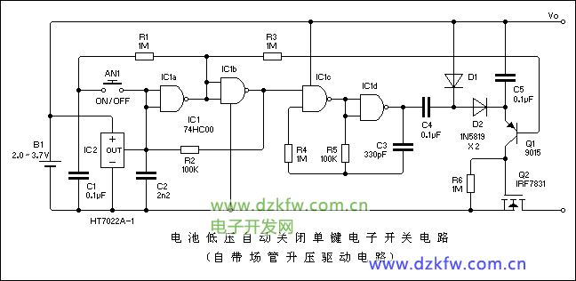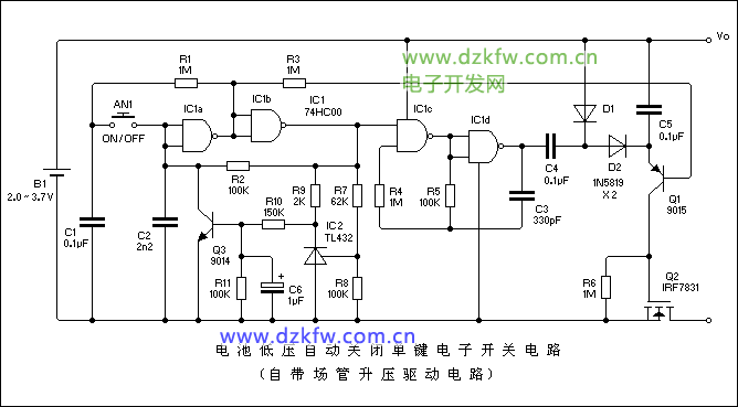 電池低電壓自動關閉單鍵電子開關電路(自帶場效應管升壓驅動電路)