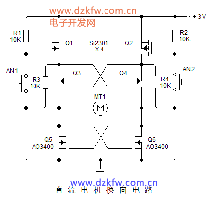 問:求兩個(gè)鍵的控制馬達(dá)正反轉(zhuǎn)開關(guān)電路,一個(gè)鍵常按正轉(zhuǎn),一個(gè)鍵常按反轉(zhuǎn),兩個(gè)鍵同時(shí)按住不放不轉(zhuǎn),電壓3V,零件越少越好,麻煩大家給個(gè)電路,謝謝了