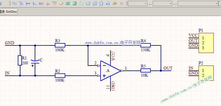 假設R1=200Ω,那么當輸入0~10mA電流信號時,R1兩端產生的壓降為0~2V,要使其產生0~5V的輸出電壓,那么確定其放大倍數為2.5,即A=2.5,如果R4=150K,R3=100K,滿足A=2.5,由于R2、R5參數的確定與電路沒有多大影響,理論上設計給定R2=100k, R5=10k。所以設計得到0~10mA/0~5V電流/電壓變換電路。如圖2.4