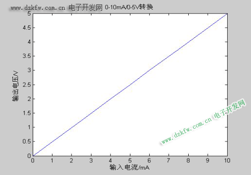 根據表4.6作出0~10mA/0~5V電流/電壓轉換電路的對應曲線圖,如圖4.4所示。由曲線可以看出,該轉換電路具有良好的線性。