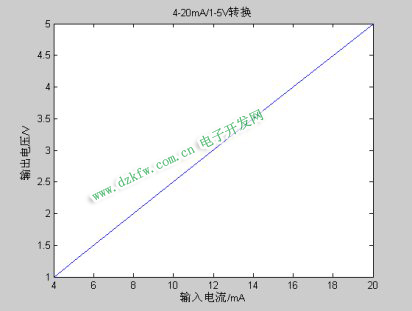 由表4.7作出4~20mA/1~5V電流/電壓轉換電路的對應曲線圖,如圖4.5所示。由曲線可以看出,該轉換電路具有良好的線性。