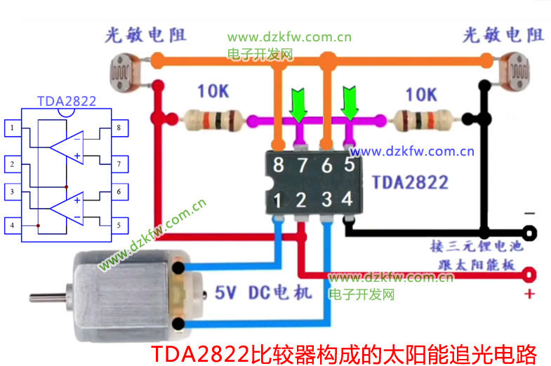 只需要幾個原件,就能DIY一個太陽能追光電路,TDA2822比較器