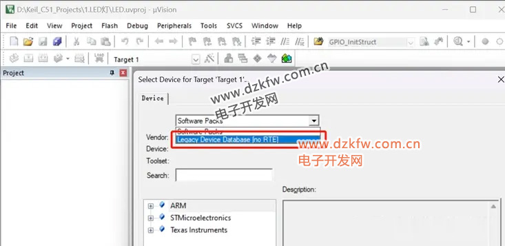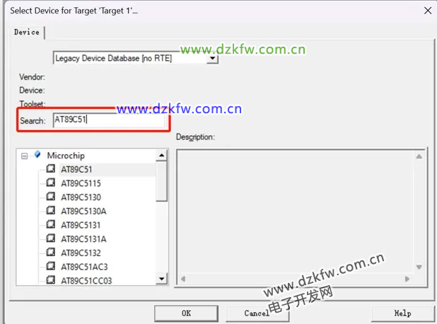- 彈出如下窗口,因?yàn)槭菍慍51代碼,所以在"Devices"選擇Lagacy Device Database;