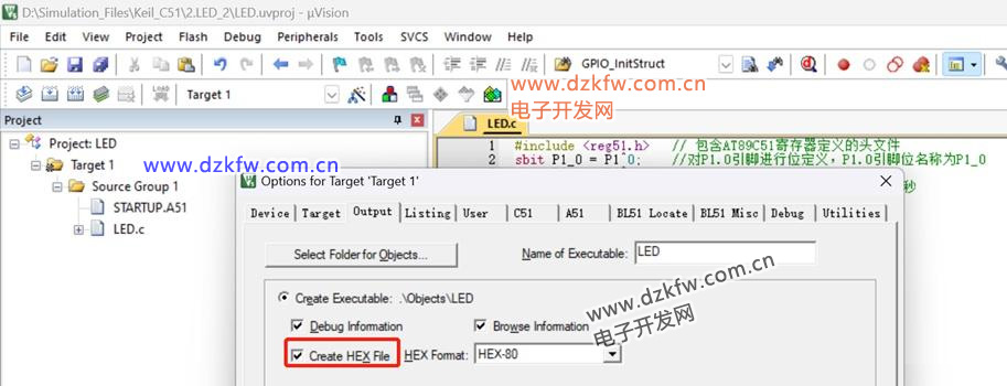 圖4.設(shè)置編譯輸出時(shí)創(chuàng)建.hex文件