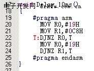 很多用C語言編單片機程序的朋友,有時候會碰上“精確延時”,而用C又要搞清楚它的編譯,往往在這個時候就想到了用匯編來編寫延時,具體怎么在C中嵌入匯編呢?其實也比較簡單,如下圖,在C文件中要嵌入匯編的地方用#pragma asm和#pragma endasm分隔開來,這樣編譯時KEIL就知道這中間的一段是匯編了。