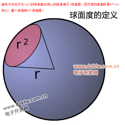 球面度(Sr=Steradian)是立體角的計量單位。面積為半徑平方(r2)的球表面對球心的張角等于1球面度。因為球的表面積是4πr2,所以,整個球面有4π球面度。一個發(fā)光強度等于1坎德拉的理想光源,每球面度能夠產(chǎn)生1流明光通量。