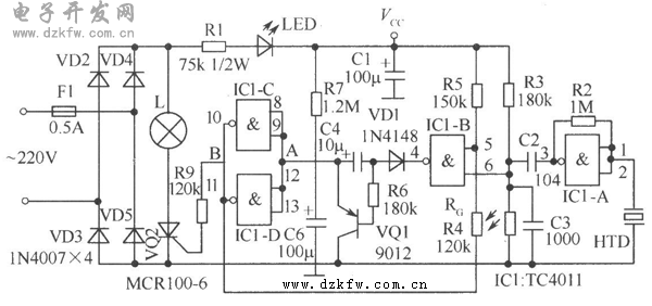 如圖所示為改進型聲光控開關,延時時間延長至3min左右,能很好地滿足用戶的使用要求,并且如果在使用時想繼續延長延時時間,可以在燈泡發光時再擊一下掌(發聲)即可,使用起來更加方便。元器件選擇IC1要選用雙輸入四與非門TC4011。RG為光敏電阻,亮電阻阻值與暗電阻阻值相差越大效果越好。電阻采用1/8W碳膜電阻。電解電容耐壓為16V,C6應選用性能好、漏電電阻值大的電解電容。電路中各元件參數見原理圖中的標識。樓道感應燈電路圖: