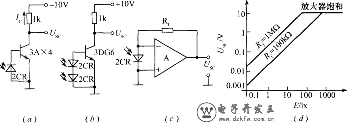 圖(A)、(B)為工作于線性區的光電流放大電路。圖(A)中的三極管必須用鍺管。因為光電池的最高開路電壓僅0.6V,而硅管一般要0.7V才導通。當光照產生的輸出電壓大于0.3V,三極管3AX4開始導通,輸出電壓Usc由-10V開始減小。由于3AX4的輸入阻值較低,可獲得較好的線性輸出。圖(B)采用兩只光電池串聯,三極管可用硅管。圖(C)所示的電路是與運算放大器相連,其等效負載電阻為零,因此運算放大器的輸出電壓等于硅光電池短路電流Isc與放大器反饋電阻Rf的乘積,即USc=IscRf,而且輸出有良好的線性,如圖(D)所示。