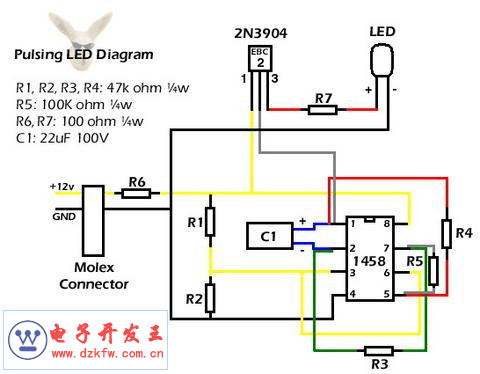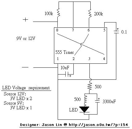 另外輸入電壓串上3個1N4007降一下壓,這樣效果會更好,呼吸燈會有短暫的熄滅時間。(只適合綠色和藍(lán)色的LED燈,紅色的LED因?yàn)榘l(fā)光電壓比較低不會有熄滅時間,可以再串一些1N4007來達(dá)到效果)