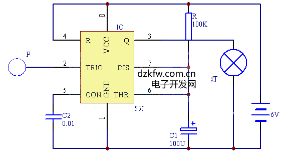 定時(shí)的長短由RC1決定的,這里的為10秒。P為金屬片由于身體感應(yīng)電壓就會(huì)使555第3腳定時(shí)輸出高電平,小燈就會(huì)點(diǎn)亮一段時(shí)間自動(dòng)熄滅!