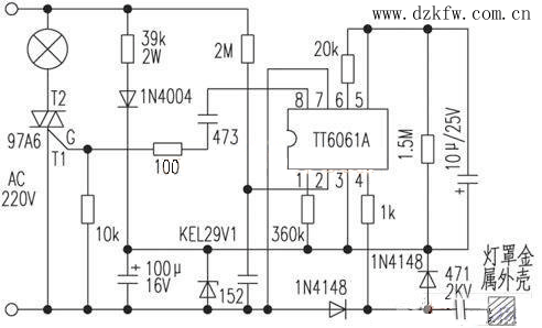 最近,筆者對一種新的觸摸式臺燈按其實物畫下了電路,現提供大家參考。電路見圖,它分四擋控制燈泡的亮度。通電后燈泡不亮,第一次輕輕觸摸一下燈罩金屬外殼。燈泡便發出低亮度的光,第二次觸摸燈泡發出中等亮度的光,第三次觸摸燈泡變為全亮,第四次觸摸燈泡熄滅,依次循環。此電路易出現的故障是雙向可控硅97A6壞及燈罩金屬外殼與電路觸摸輸入端子之間接觸不良。筆者調試該電路時,TT6061用GS6061代,1N4004用1N4007代,其余元件與圖中同。經驗證,電路工作可靠,能實現文中所述功能。但雙向可控硅易損壞,建議讀者制作時在可控硅兩端并聯一電阻電容串聯所組成的保護電路。