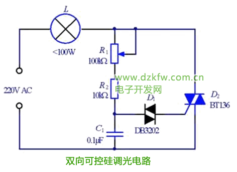 220V交流電經過電位器和限流電阻給C1反復的充放電,C1充電過程中,電壓首先上升,當電壓超過D1的門限電壓的時候,D1導通,進而D2導通,由D2導通引起負載L工作。其實在一個周期內,D1的電壓或者說C1點的電壓只要低于30V這個門限值,D1立刻斷開,同時也會導致D2斷開,那么一個交流電D1閉合的時間長短其實就決定了負載的亮暗,那么什么決定D1的導通時間呢?那就是C1的充電電壓,C1的充電電壓又受制于充電速度,充電速度受制于R1+R2的電阻,電阻越小充電越快,電阻越大充電越慢,這樣我們可以通過調劑電位器電阻的大小進而影響C1的充電速度,從而調節負載的亮暗。