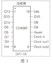 CD4060為16管腳DIP封裝,各管腳排列如圖3所示。其中Clock in是時鐘脈沖輸入,Clock out1及Clockout2是時鐘脈沖輸出(相位差180°,Reset是復位輸入端(高電平有效).Q4~Q14是二進制記數脈沖輸出端,Vdd為電源正端(3~18V).Vss為電源負端。