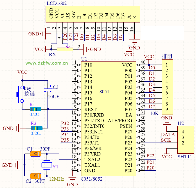 通過AD19繪制出如上圖所示的原理圖,包括時鐘電路、晶振電路、DHT11溫濕度檢測電路、lcd1602顯示電路,因為溫濕度傳感器與單片機連接電路比較簡單。所以可以容易的繪制出電路圖。