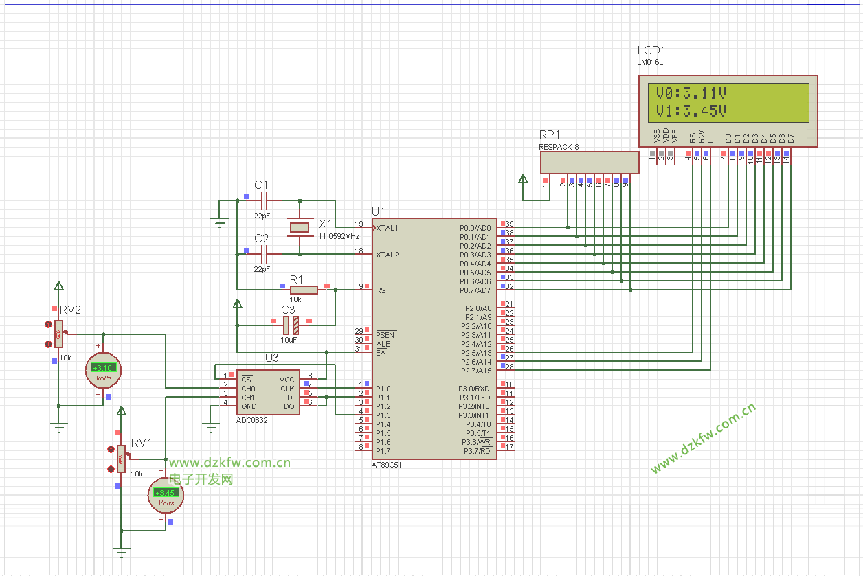 2、ADC0832模數(shù)轉(zhuǎn)換器進行A/D轉(zhuǎn)換,讀取電壓兩路數(shù)據(jù),電壓檢測范圍0-5V 精度(8位)