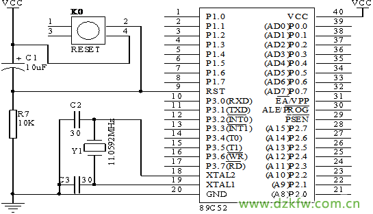 當在89C5x單片機的RST引腳引入高電平并保持2個機器周期時,單片機內部就執行復位操作,按鍵手動復位有電平方式和脈沖方式兩種。其中電平復位是通過RST端經過電阻與電源VCC接通而實現的。