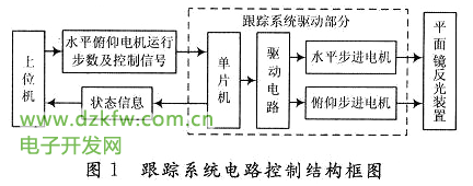 本文介紹的是一種基于單片機控制的雙軸太陽自動跟蹤系統,系統主要由平面鏡反光裝置、調整執行機構、控制電路、方位限位電路等部分組成。跟蹤系統電路控制結構框圖如圖1所示,系統機械結構示意圖如圖2所示。