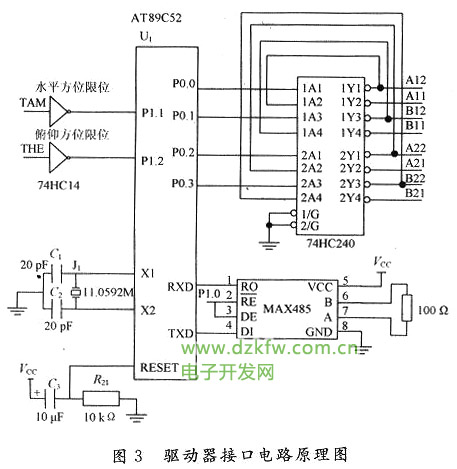 跟蹤系統中微處理器選用89系列性價比高和功耗低的89C52。74HC14芯片是6非門施密特觸發器,與P1.1和P1.2口相連,控制方位限位信號。74HC240芯片,八反相三態緩沖器/線驅動器,用于數據緩沖及總線驅動。系統使用兩片74HC240芯片,通過P0口引腳控制,兩片74HC240的16個輸出引腳作為步進電機驅動電路的輸入控制信號,分別控制步進電機俯仰方向和水平方位的正反轉。系統與上位機的通信選用MAX485接口芯片,由P1.0口控制其收發狀態。驅動器接口電路如圖3所示。