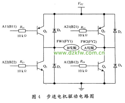 步進電動機是一種用電脈沖信號進行控制,并將電脈沖信號轉換成相應角位移的執行器。在跟蹤系統中,以74HC240的16個輸出信號作為步進電機驅動器的輸入控制信號,用以控制步進電機俯仰方向和水平方位的正反轉。圖4所示的是步進電機一路驅動電路圖,系統共有四路驅動電路,分別驅動步進電機俯仰方向和水平方位的正反轉。