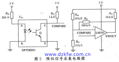 采用光電耦合器與電壓比較器電路組成的微機步進電機限位電路,其電路圖如圖5所示。